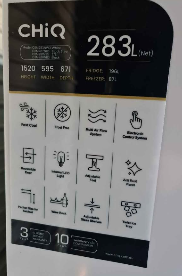 This Chiq Near New 283L Bottom Mount Fridge offers reliable refrigeration with a spacious 283-litre capacity and convenient bottom mount design for easy access. Fully cleaned and tested, it ensures peak performance and freshness. We provide delivery, professional installation, and removal of your old appliance for a seamless transition. Purchase with confidence thanks to a 3-month warranty and the option to pay later with Afterpay. Ideal for those seeking quality and convenience in one package.