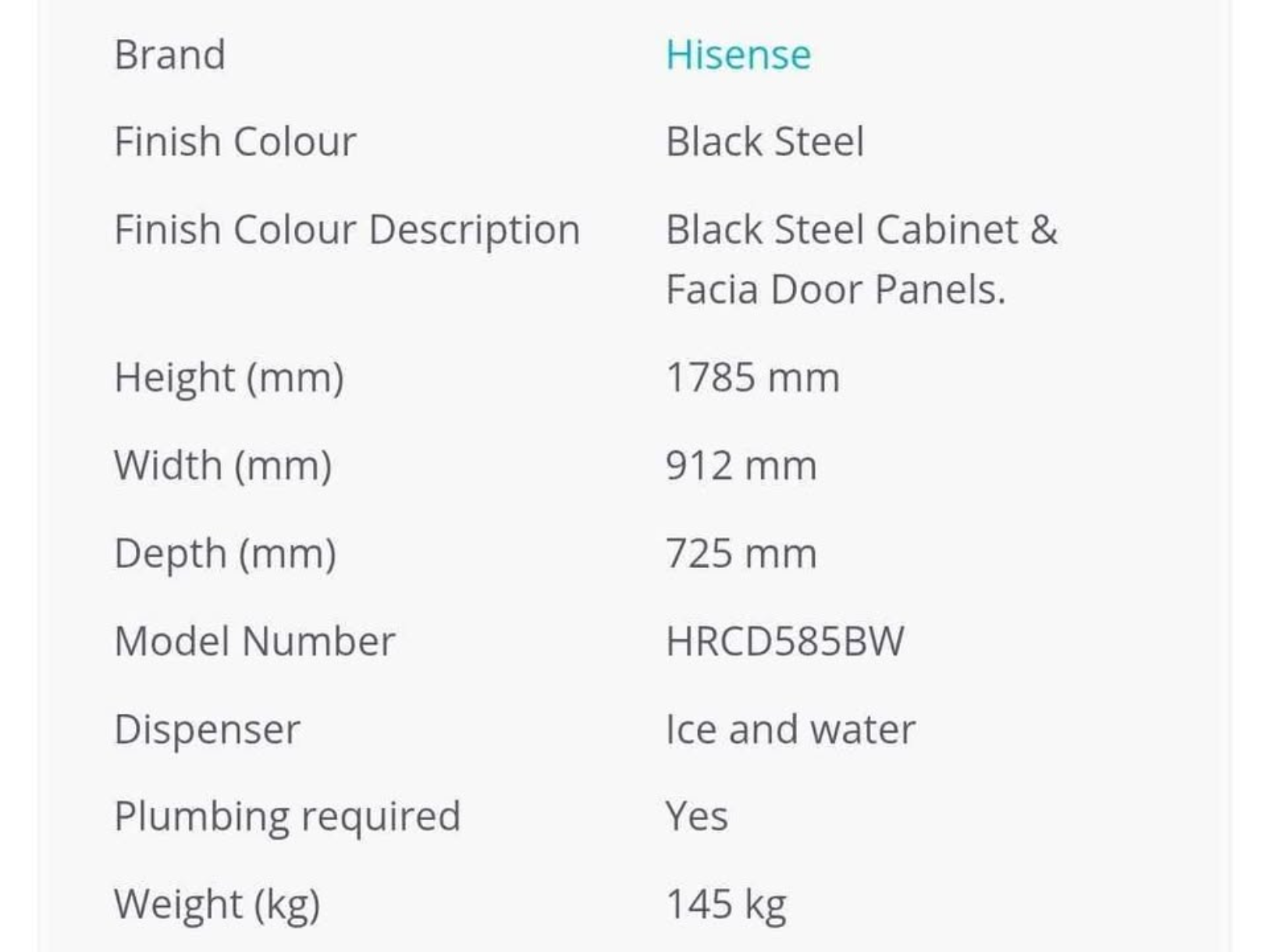 This Hisense 4 Door Ice/Water Black Fridge with a spacious 585L capacity has been thoroughly cleaned, serviced, and tested to ensure reliable performance. It includes a 3-month warranty for your peace of mind. We offer delivery, professional installation, and removal of your old appliance for a seamless upgrade. Afterpay is also available for convenient payment options. Perfect for keeping your food fresh and beverages chilled with built-in ice and water dispensers.